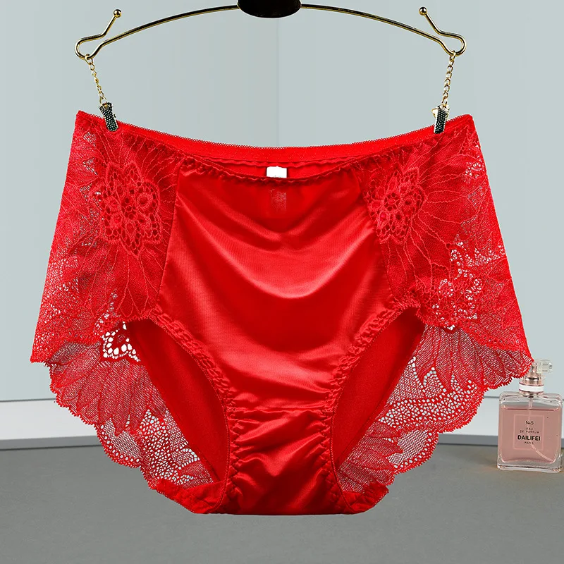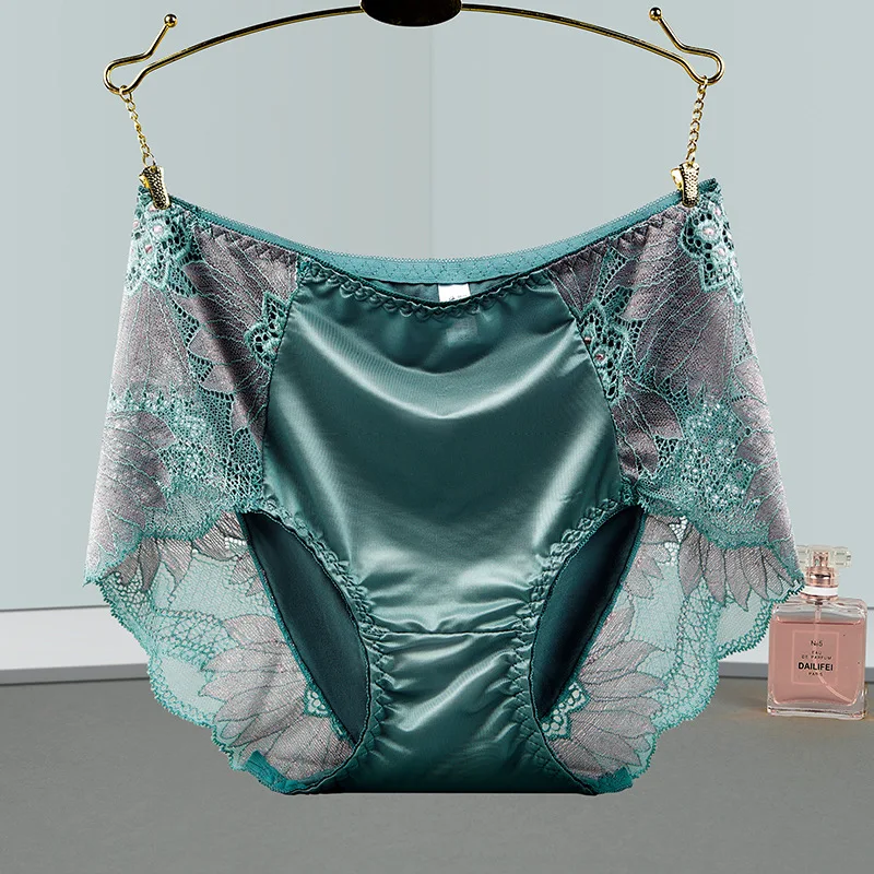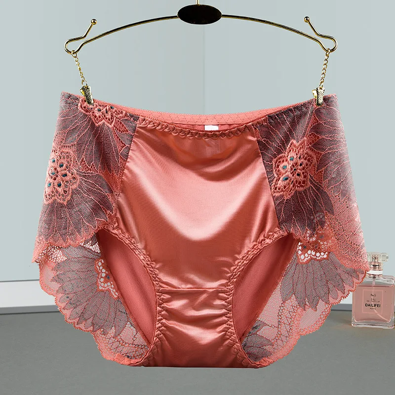 Women Satin Soft Luxury Style Middle Waist Underwear Elegant Exquisite Flower Embroidery Breathable Elasticity Panties Breifs