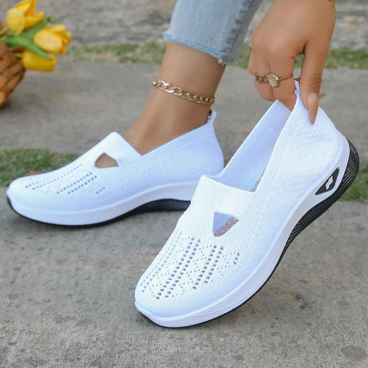 Women’s shoes, women’s casual shoes, solid color breathable sports shoes, soft-soled lightweight walking shoes, low-top knitted